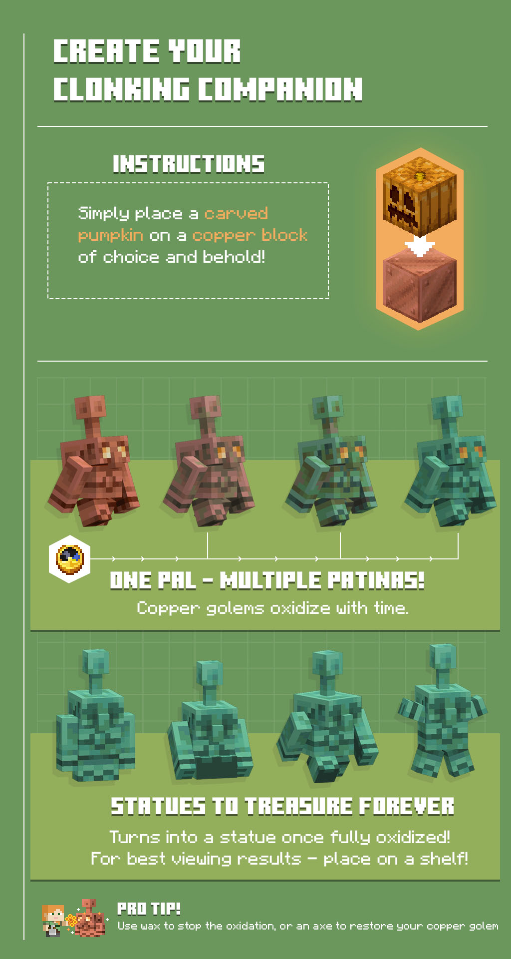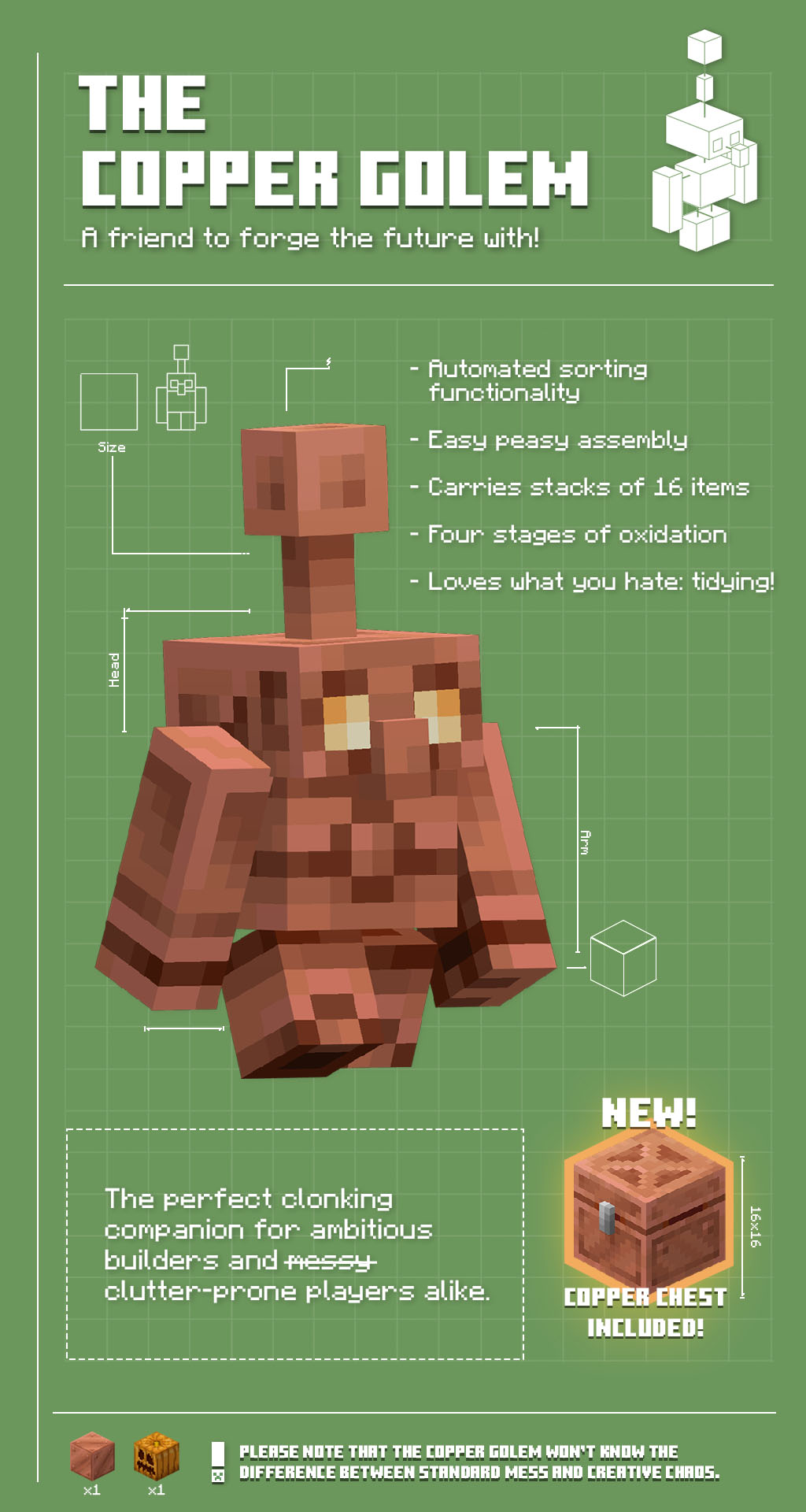 The Copper Age encouraged Minecraft players to express themselves in every shade of copper with a suite of new oxidixing features added to the game. Heading up this new clonking era of creativity was the copper golem – a mechanical companion organizing your base.